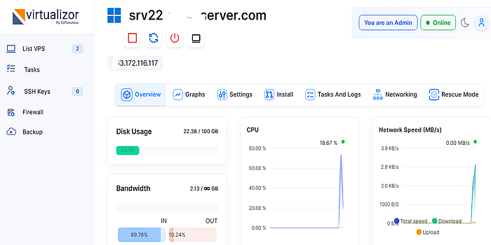 You will recieve details to VIrtualizor control panel where you can manage/ maintain your VPS including reboot, edit, turn off and on your server as shown below